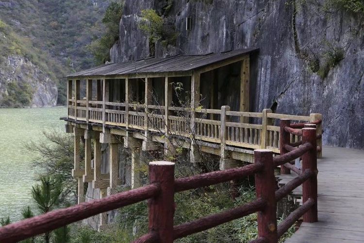 石门水库的修建使古老的栈道沉没在茫茫的水晶宫中,而如今石门旅游大开发,石门旅游公司在古老栈道基础上,抬高路基近八十米,恢复了这一古老的栈道奇观。这条仿古栈道南北走向全长3.6公里,投资987万,将古栈道的多种建筑形式一一复原,让您身临其境,重现栈道辉煌。山谷地形复杂,为了在陡峭的山壁上开辟道路,古代劳工者依据不同地形,创造了多样的道路形式。“平梁立柱式”“石基式”“多层平梁立柱加棚盖式”“千梁无柱式”等多种形制在这段栈道当都有所体现,游客朋友们不妨仔细观察,细细体会,您一定会被古人们的聪明才智以及不畏艰难,勇往直前的精神所感染。